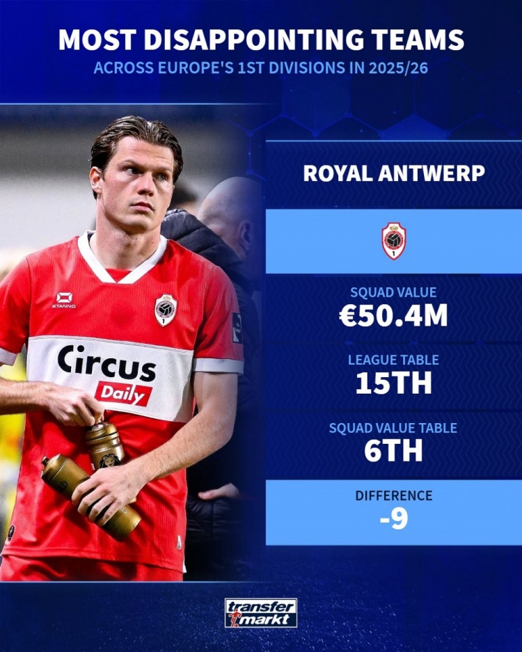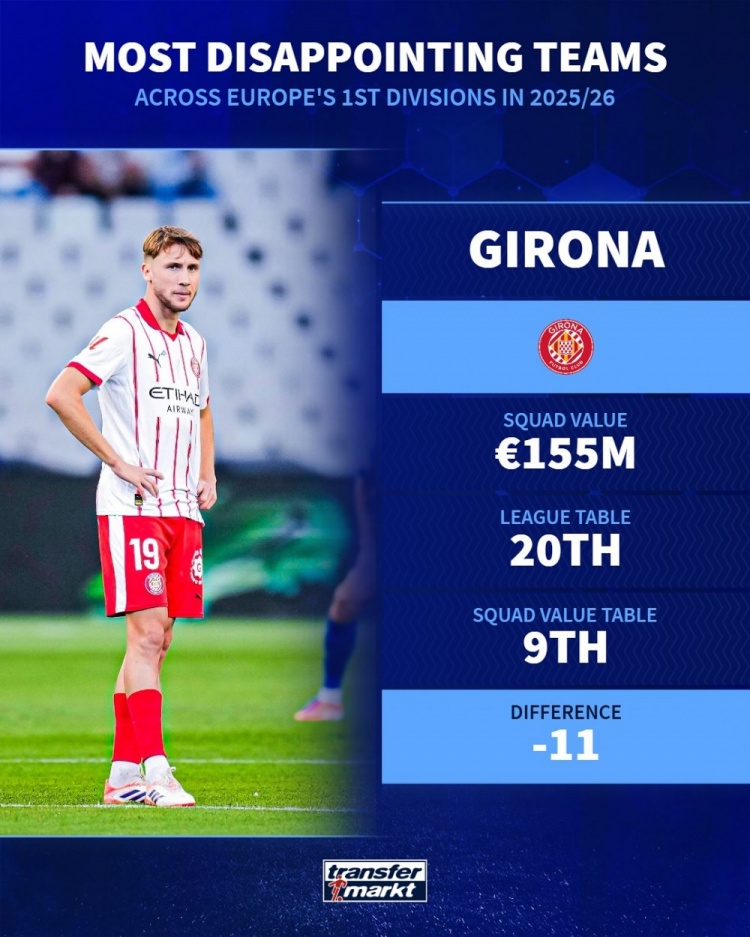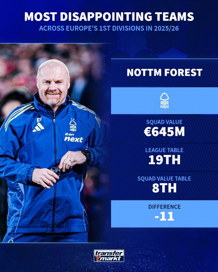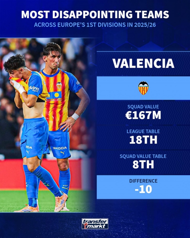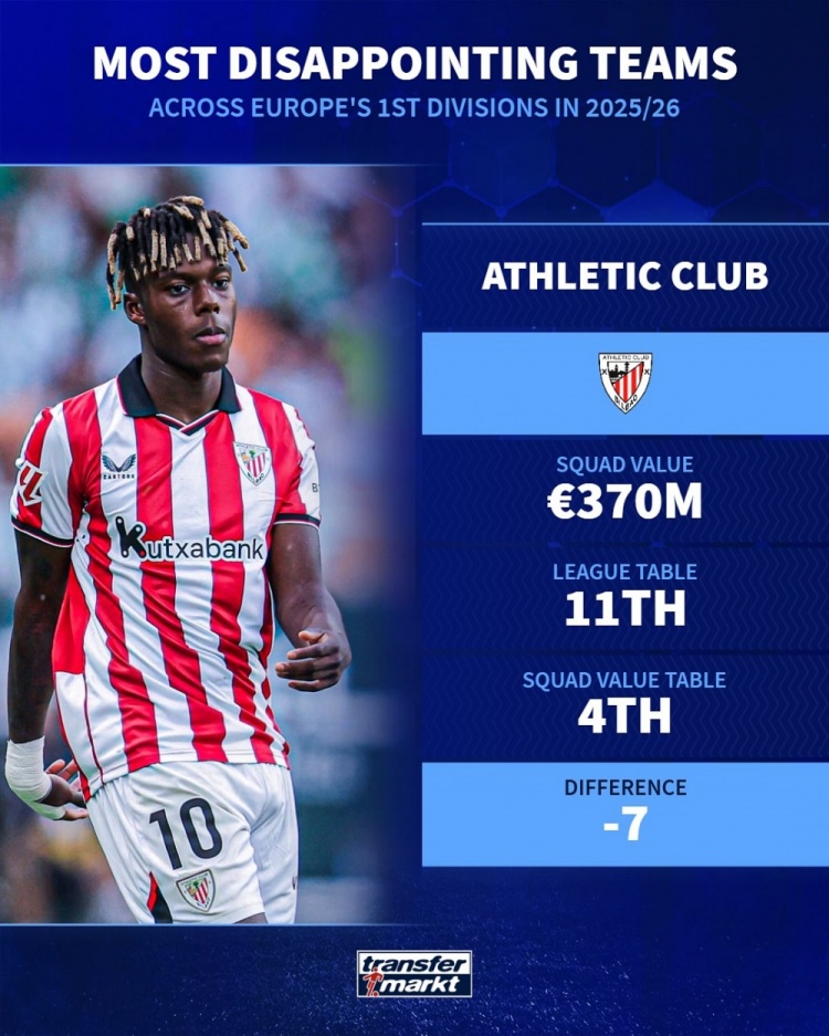 Thị trường chuyển nhượng Đức đã liệt kê những đội gây thất vọng nhất ở các giải đấu hàng đầu châu Âu mùa này dựa trên giá trị của đội và thứ hạng hiện tại. Fiorentina, Newcastle United và Athletic Bilbao có tên trong danh sách.