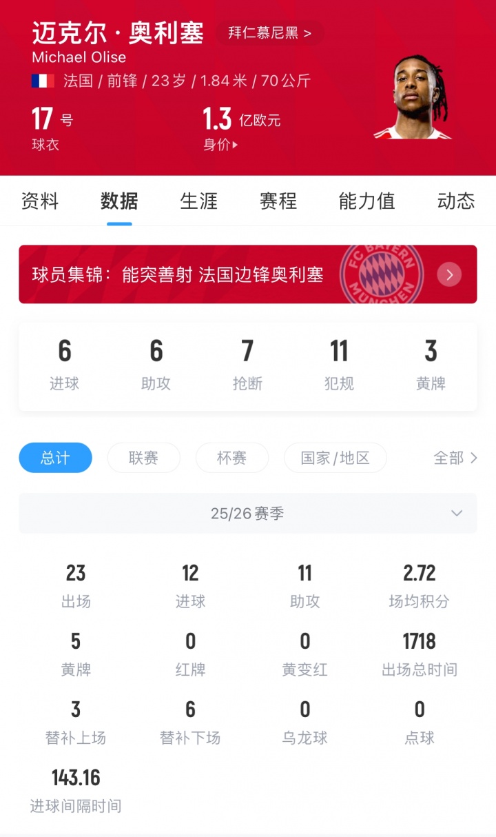 Cầu thủ 23 tuổi Olise đã ghi 5 bàn trong trận đấu này và dẫn đầu cuộc lội ngược dòng. Olise đã ra sân 23 lần cho Bayern mùa này và đóng góp 12 bàn thắng cùng 11 đường kiến tạo, cực kỳ hiệu quả.